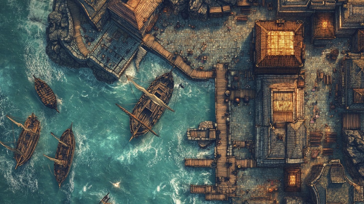 Создано на основе запроса: Topdown view tactical combat map rpg. Fantasy map, topdown view large city, A sprawling medieval fantasy port city built into seaside cliffs, with massive wooden and stone shipyards along a deep bay. Countless sailing ships docked at towering piers, giant cranes and drydocks building warships, misty ocean waves crashing below. The city rises in tiers --- Автоперевод: Просмотр нанесения тактической боевой карты RPG. Как тебе такая иллюстрация? 🤔 https://dzen.ru/id/65c0c65c86e4f837c27b24d7 #ИИ #AI #нейросеть #midjourney #art