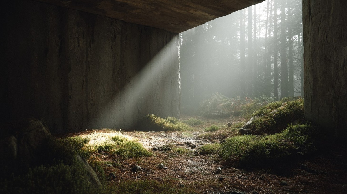 Создано на основе запроса: concrete space in a forest, moss, light beam through trees, soft fog, earthy color palette, cinematic atmosphere
