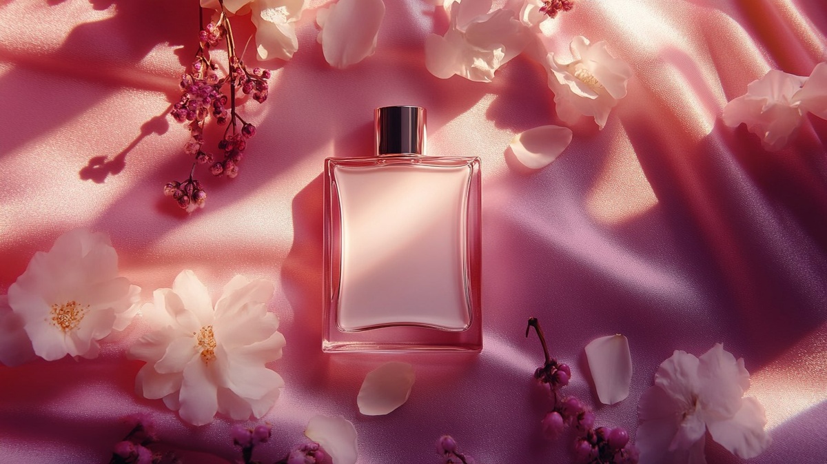 Создано на основе запроса: artistic flatlay of fragrance ingredients: blackcurrant, jasmine flower, bourbon vanilla bean on a pink velvet