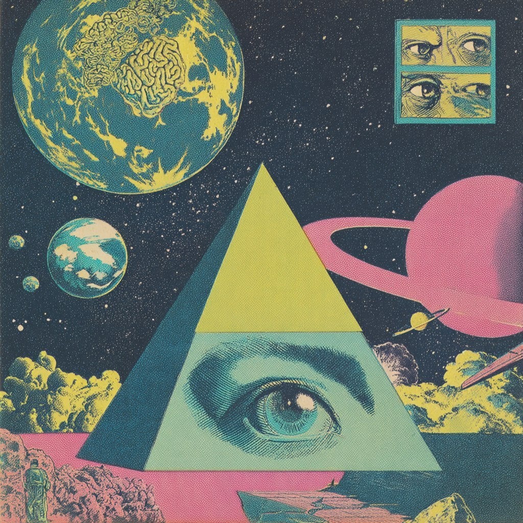 Создано на основе запроса: iconography album covers of the 70s and 80s grotesque, Surreal and detailed illustrations the brain experiencing ayahuasca in space, three eyes looking at the viewer are connected by a triangle, sophisticated pastel color palette --- Автоперевод: Иконографические обложки альбома 70 -х и 80 -х годов гротескные, сюрреалистические и подробные иллюстрации, которые мозг испытывает аяхуаски в космосе, три глаза, глядя на зрителя Как тебе это изображение? 🤔 https://dzen.ru/id/65c0c65c86e4f837c27b24d7 #ИИ #AI #нейросеть #midjourney #art