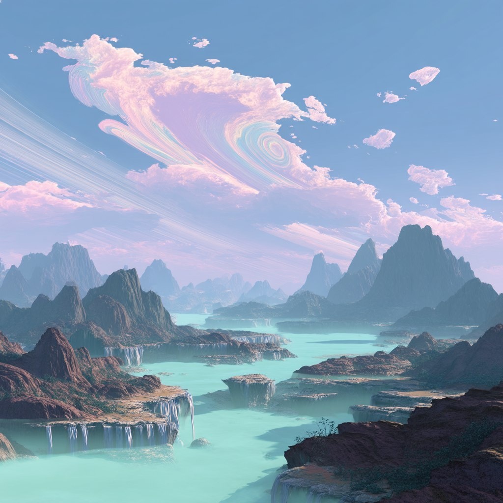Создано на основе запроса: Create a panoramic landscape of an imaginary planet called Nebulon. The landscape features impressive mountain ranges floating in the air, detached from the ground, with waterfalls flowing from them into a light turquoise mist below. The color palette consists of shades of turquoise and blue-green in the skies, with spiral clouds in delicate pink and metallic gold that glow from within --- Автоперевод: Создайте панорамный ландшафт воображаемой планеты под названием Nebulon. Как тебе этот вариант? 🤔 https://dzen.ru/id/65c0c65c86e4f837c27b24d7 #ИИ #AI #нейросеть #midjourney #art