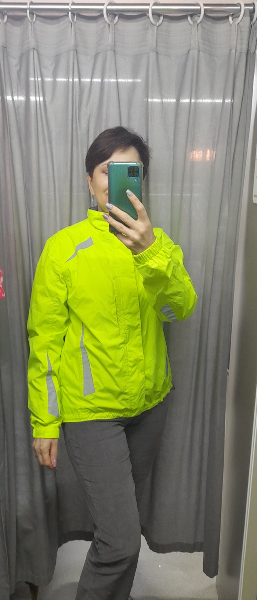 Лаймовая, со светоотражающими полосками. Сзади она длиннее, прикрывает ..опу.🤣