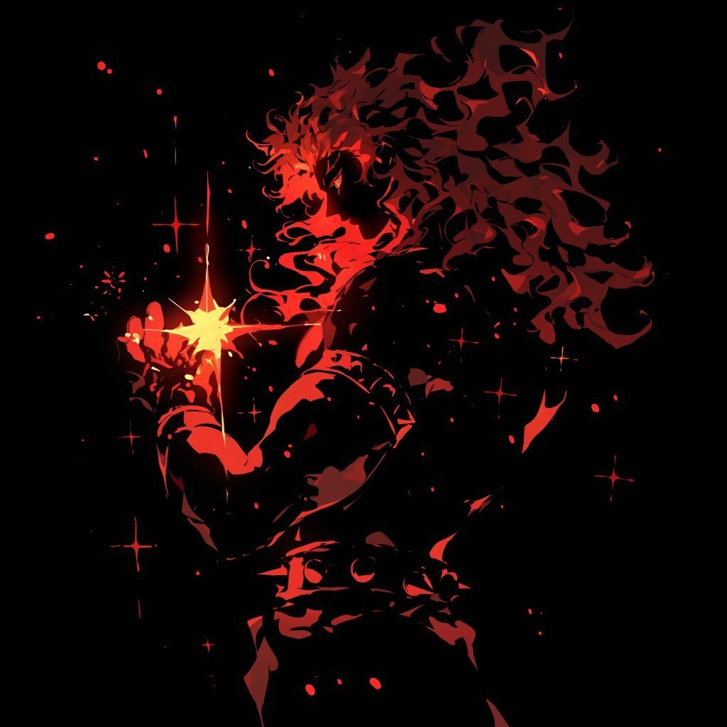 Создано на основе запроса: a small red sparkle, a silhouette of a muscular male with long curly hair in the center of the sparkle, black