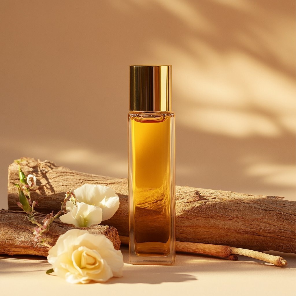 Создано на основе запроса: Product photography of an amber glass roller bottle with a gold lid. The cap fits the whole circumference of the bottle, filled with yellow oil perfume liquid. The bottle is surrounded by wood planks. There is also jasmine and rose. There is wood and also vanilla sticks. All set against a beige background in a minimalistic style with warm tones. Image taken in the desert. Minimalist style with neutral tones, soft lighting, and high resolution. High-resolution image shot with a Canon EOS R5. --- Автоперевод: Фотография продукта из янтарной стеклянной бутылки с золотой крышкой. Классно получилось? 🤔 https://dzen.ru/id/65c0c65c86e4f837c27b24d7 #ИИ #AI #нейросеть #midjourney #art