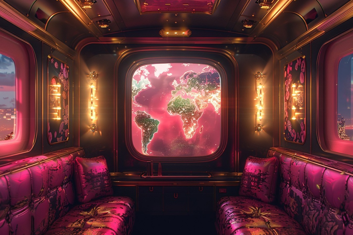 Создано на основе запроса: Afrofuturistic luxury travel scene, black and gold color base with hot pink and neon green elements glowing throughout the cabin, window reveals dreamlike world map in bright colors, rich textures, powerful feminine energy --- Автоперевод: Афрофутуристская сцена роскошного путешествия, черно -золотой цвет с ярко -розовыми и неоново -зелеными элементами, светящимися по всей каюте, окно показывает сказочную карту мира в ярких цветах, богатых текстурах, мощной женской энергии Отлично получилось? 🤔 https://dzen.ru/id/65c0c65c86e4f837c27b24d7 #ИИ #AI #нейросеть #midjourney #art