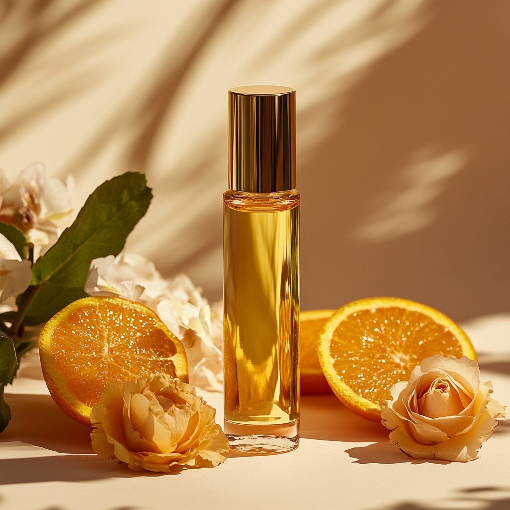 Создано на основе запроса: Product photography of an amber glass roller bottle with a gold lid. The cap fits the whole bottle's circumference, filled with yellow oil perfume liquid. The bottle is surrounded by orange slices, damask rose and jasmine. All set against a beige background in a minimalistic style with warm tones. Image taken in the desert. Minimalist style with neutral tones, soft lighting, and high resolution. High-resolution image shot with a Canon EOS R5. --- Автоперевод: Фотография продукта из янтарной стеклянной бутылки с золотой крышкой. Отлично выглядит? 🤔 https://dzen.ru/id/65c0c65c86e4f837c27b24d7 #ИИ #AI #нейросеть #midjourney #art