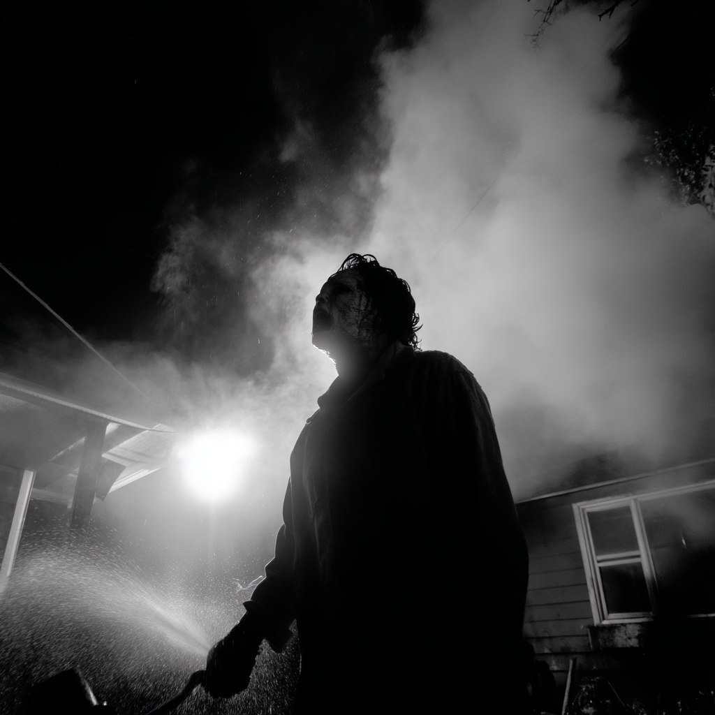 Создано на основе запроса: black and white low-budget slasher cinematic film noir still / zombie attack / chaotic / raw / volcanic intensity