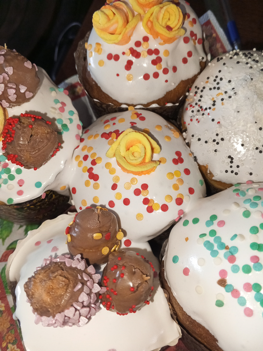 Вот и главное пасхальное блюдо - куличи. Я пеку так, как всегда пекла мама. Сразу скажу, что не взвешиваю продукты. Делаю "на глаз". Вам пропишу примерные пропорции. Все продукты вытаскиваю заранее, чтобы были комнатной температуры. 0.5 л молока + 1 стакан кипятка. Перемешиваю, получаю температуру тела - это оптимальная температура для дрожжей. Добавляю около стакана сахара. Кто любит слаще, можно побольше, но тесто будет более тяжёлое. 1 чайная ложка соли. 1 пачка дрожжей (11 грамм). Муки около стакана. Все перемешать, оставить подходить до шапочки. Как только тесто поднялось, начинаю замес. Промываю изюм, пока буду замешивать, он постоит замеченным. Беру 7 яиц. У 3- х отделяю белки, их убираю в холодильник. 4 целых яйца и 3 желтка перемешиваю вилкой. Грамм 200 сливочного масла и 50 грамм растительного растапливаю до жидкого тёплого состояния. В поднявшуюся опару вливаю яйца, высыпаю муку, хорошо перемешиваю. На этом этапе можно добавить куркуму, шафран для цвета. Можно не добавля