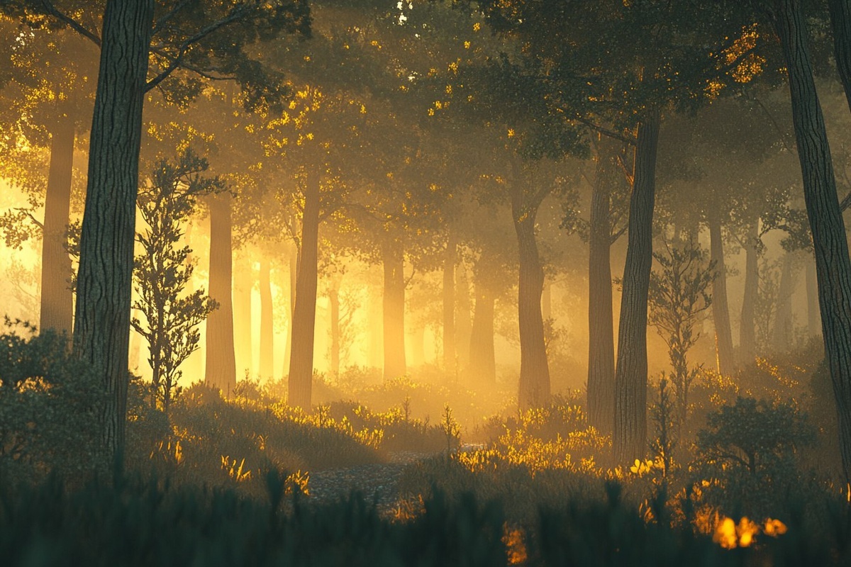 Создано на основе запроса: a serene forest at dawn, soft golden sunlight filtering through tall trees, gentle morning mist hovering above