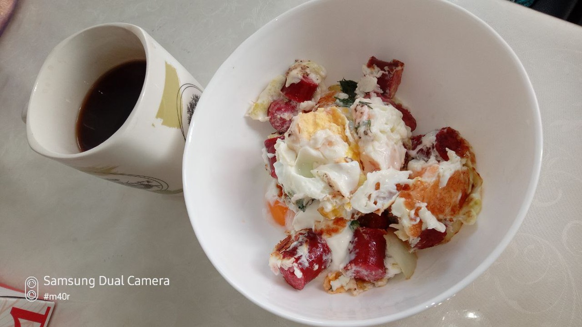Яичница из 5 яиц и 150 грамм охотничьих колбасок плюс зелень