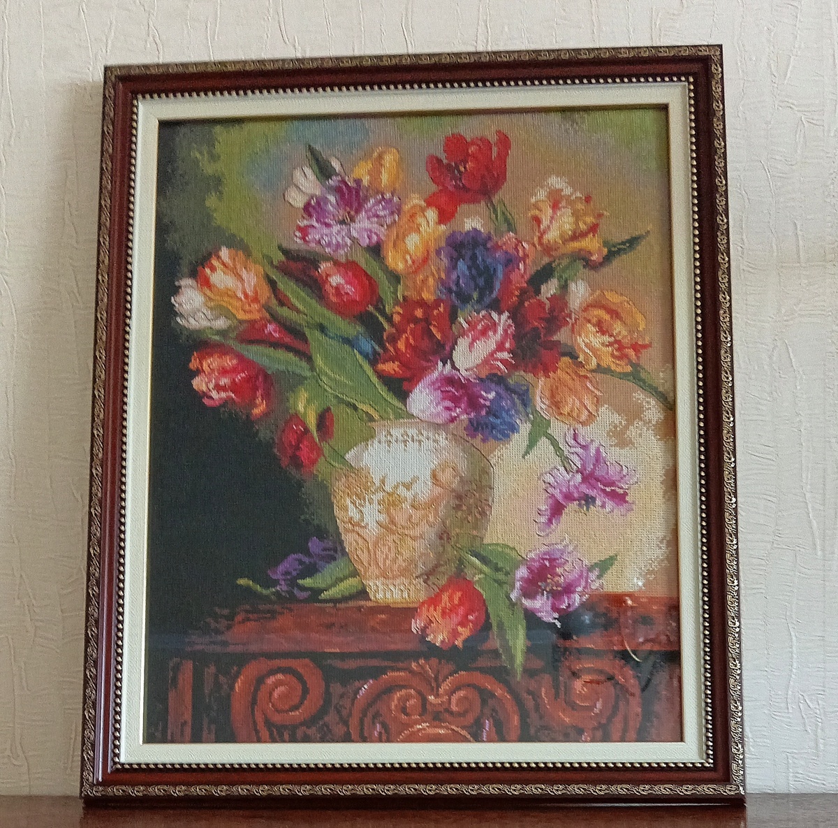 Всем привет! Оформила свою вышивку "Попугайные тюльпаны" от фирмы Клубок желаний. О процессе этой вышивки у меня много статей. О готовой работе можно почитать тут: Эта статья об оформлении вышивки. Наконец-то в нашем городе появилась багетная мастерская, где работает настоящий профессионал своего дела. Если эту статью читают вышивальщицы из Таганрога, то я с радостью поделюсь адресом: ул. Транспортная, 63. Кажется, раньше там была аптека. Хочу подчеркнуть, что это не реклама, а информация, полученная из личных наблюдений. Я нашла мастера на сайте Авито. Ранее я уже рассказывала о негативных опыте общения с багетчиками из нашего города. В последнее время я предпочитала заказывать рамы и натягивать вышивку самостоятельно. Мы с подругой приобрели много рам в другом городе. Хотя подбор оформления через интернет был сложным, но даже с доставкой это оказывалась дешевле. Недавно это производство закрылось. Тогда я снова обратилась к поиску на Авито и нашла мастера из нашего города.
