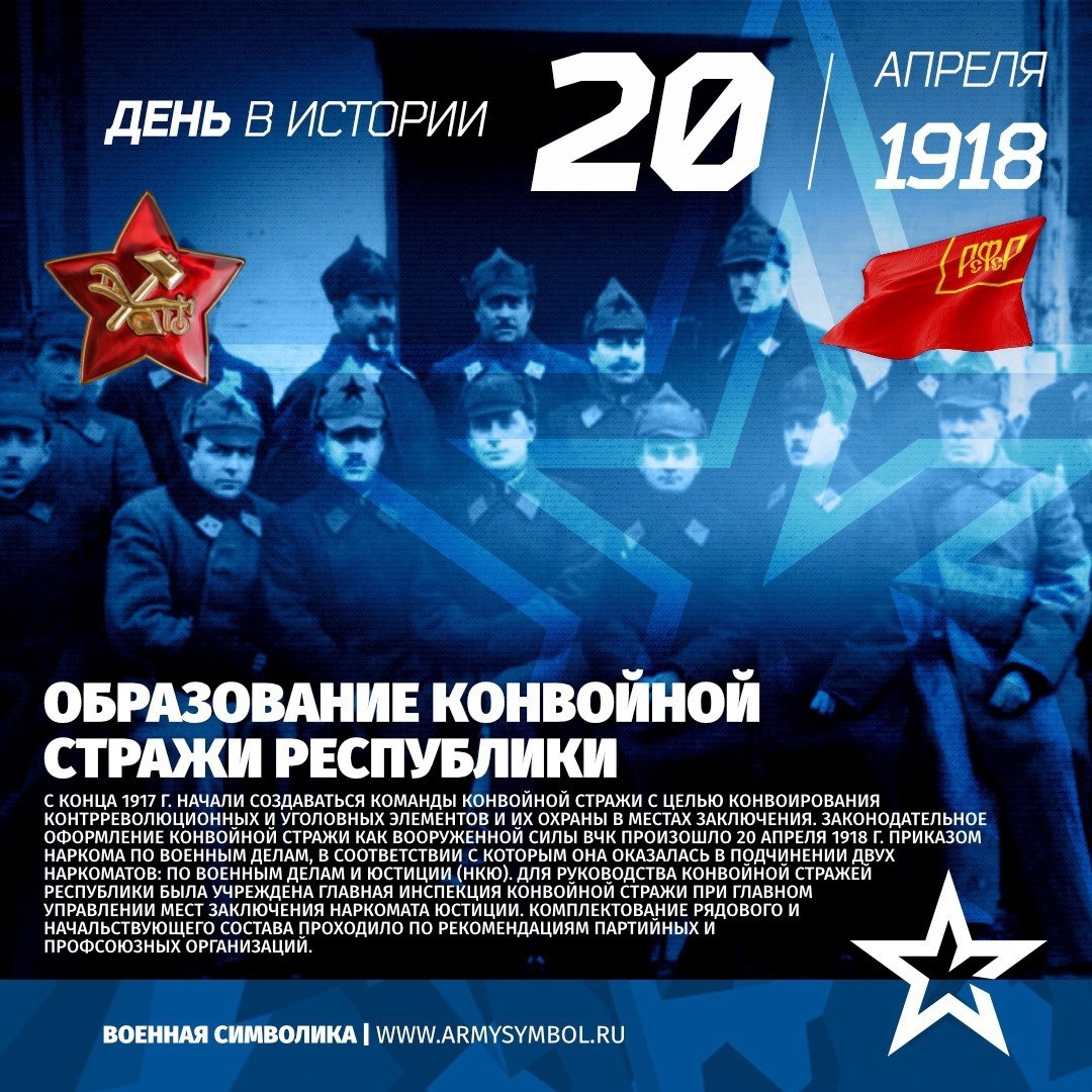 Образование Конвойной стражи Республики в 1918 С конца 1917 г. начали создаваться команды конвойной стражи с целью конвоирования контрреволюционных и уголовных элементов и их охраны в местах заключения. Законодательное оформление конвойной стражи как вооруженной силы ВЧК произошло 20 апреля 1918 г. приказом наркома по военным делам, в соответствии с которым она оказалась в подчинении двух наркоматов: по военным делам и юстиции (НКЮ). Для руководства конвойной стражей Республики была учреждена Главная инспекция конвойной стражи при Главном управлении мест заключения Наркомата юстиции. Комплектование рядового и начальствующего состава проходило по рекомендациям партийных и профсоюзных организаций. К концу года было сформировано более 100 конвойных команд в разных городах страны. К основным задачам конвойной стражи относились: конвоирование преступников в судебные учреждения и места з Показать полностью... Подпишитесь на наши группы ВКонтакте и в Одноклассниках - читайте, смотрите и ко