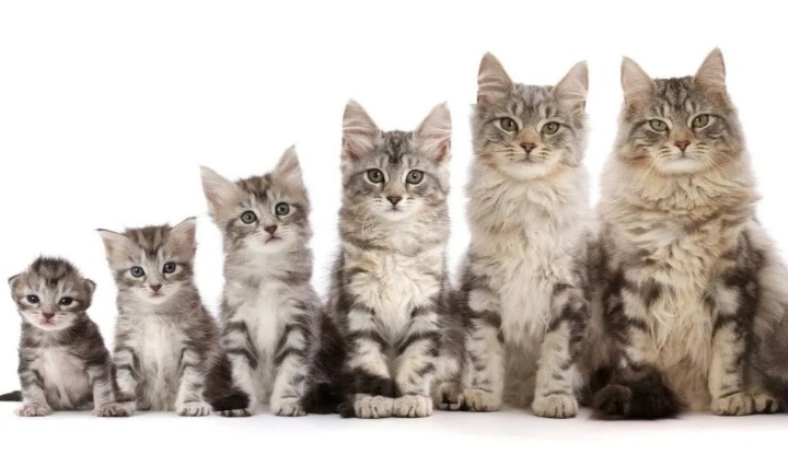 Если бы всё было так просто, то 10-летний кот уже получал бы пенсию и ворчал на молодежь. Но реальность сложнее. Кошки взрослеют неравномерно: первые два года они растут как на дрожжах, а затем процесс замедляется. Вот пример: