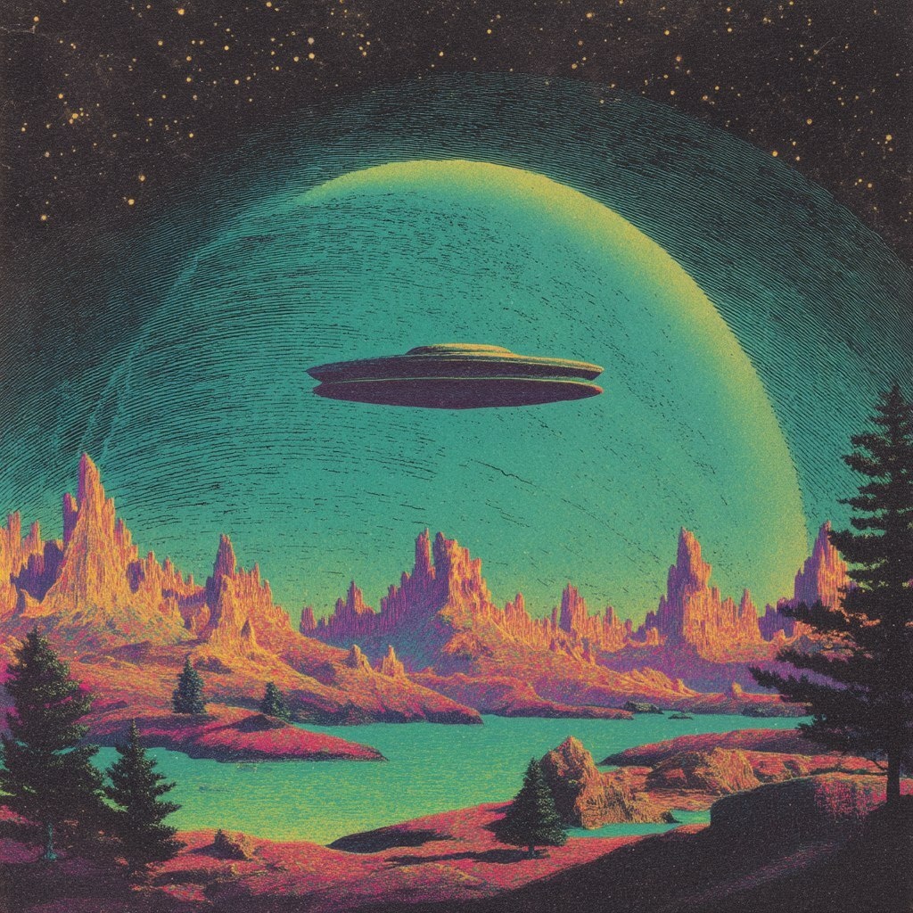 Создано на основе запроса: iconography album covers of the 70s and 80s grotesque, Surreal and detailed illustrations mothership floating
