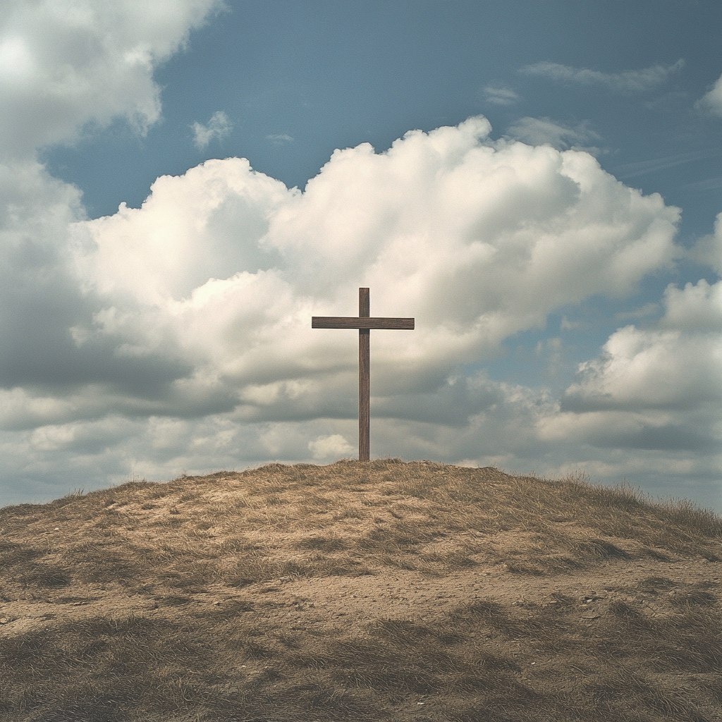 Создано на основе запроса: empty wooden cross standing on hill, symbolic stillness, biblical era, no people, Golgotha hill, cross casting