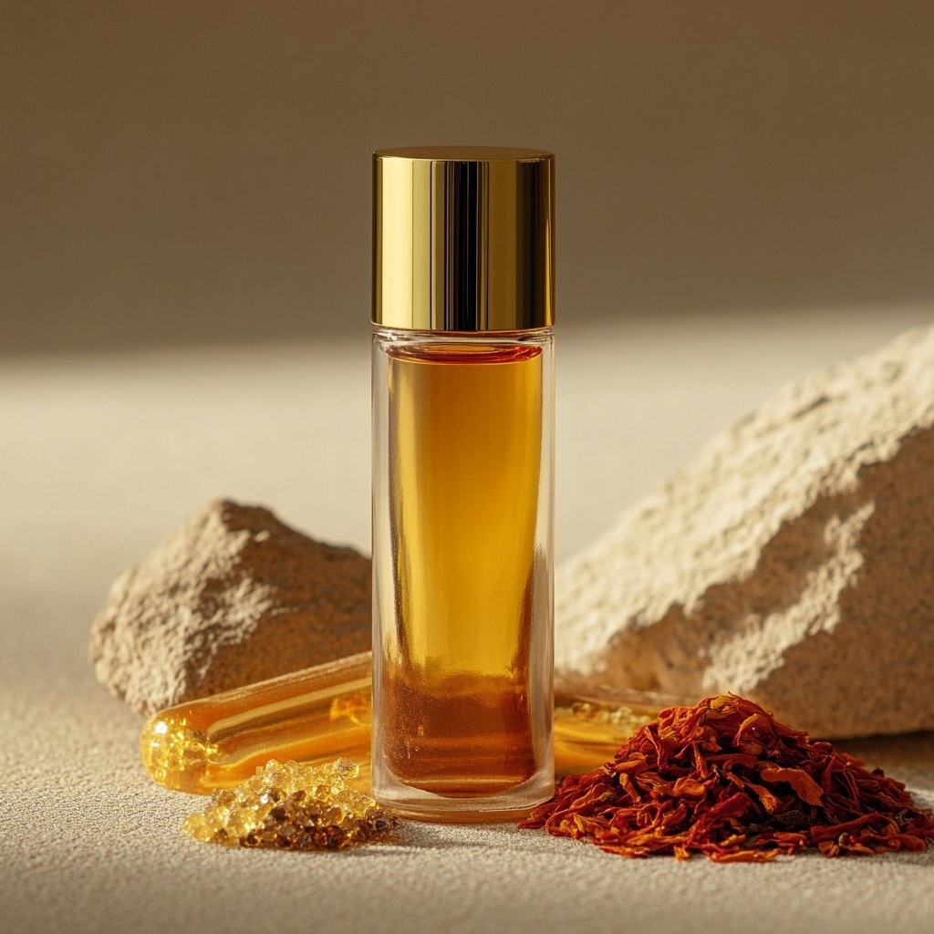 Создано на основе запроса: Midjourney Bot APP 23:47 Product photography of an amber glass roller bottle with a gold lid. The cap fits the whole bottle's circumference, filled with yellow oil perfume liquid. The bottle is surrounded by oud chips, saffron, amber and sandalwood. All set against a beige background in a minimalistic style with warm tones. Image taken in the desert. Minimalist style with neutral tones, soft lighting, and high resolution. High-resolution image shot with a Canon EOS R5. --- Автоперевод: Midjourney Bot App 23:47 Фотография продукта из янтарной стеклянной бутылки с золотой крышкой. Что думаешь? 🤔 https://dzen.ru/id/65c0c65c86e4f837c27b24d7 #ИИ #AI #нейросеть #midjourney #art
