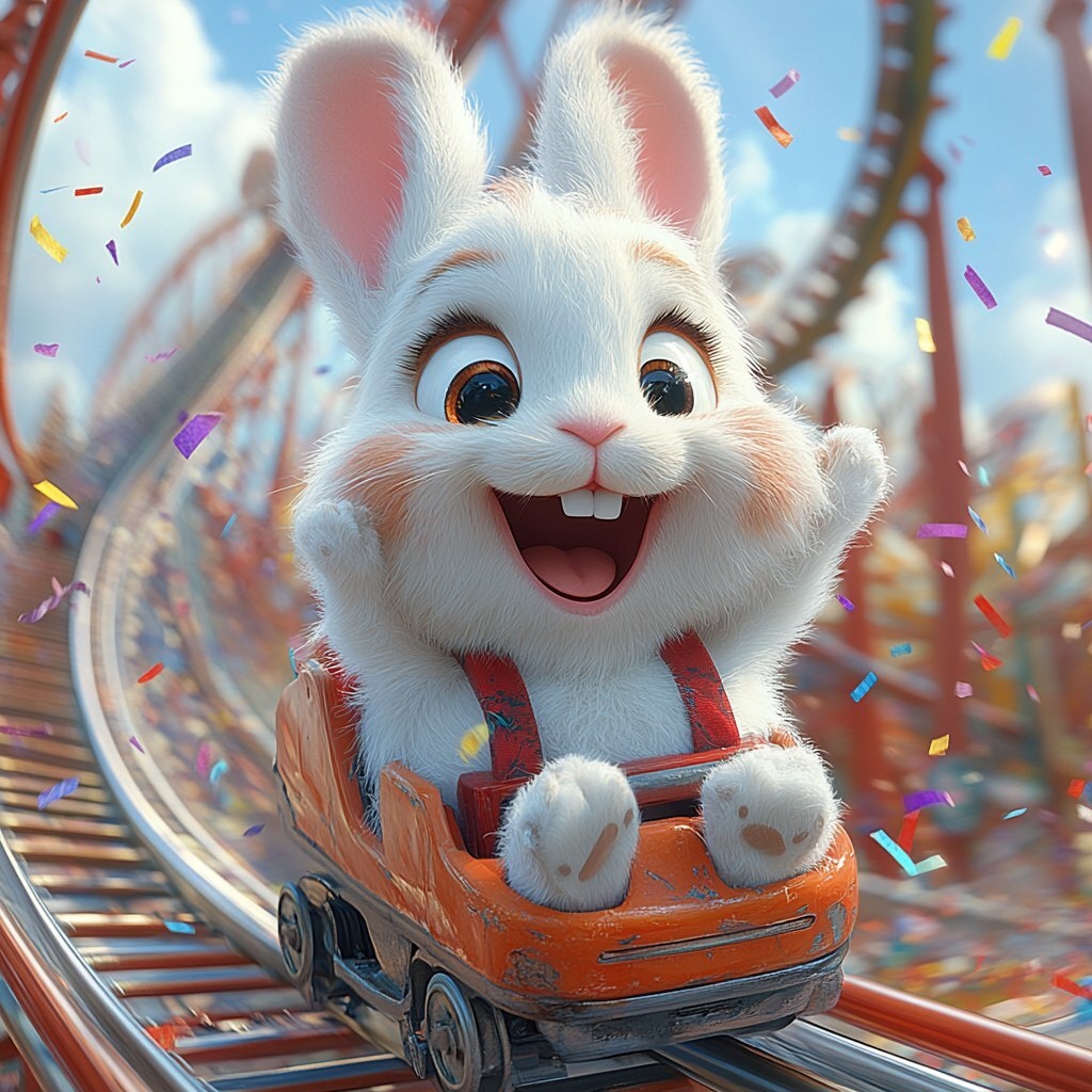 Создано на основе запроса: a funny cartoon animated image of an Easter bunny on a roller coaster with confetti all around the air