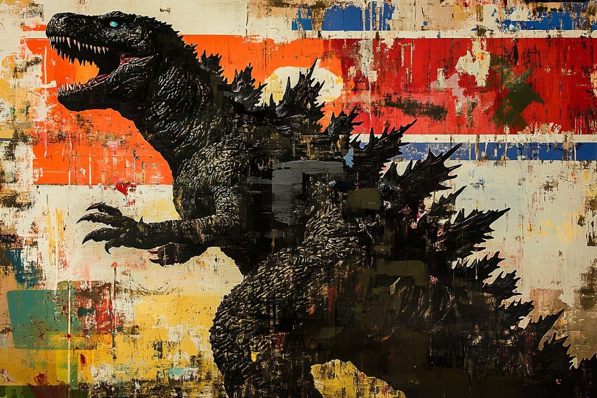 Создано на основе запроса: : north korean propaganda poster of a Godzilla, contemporary spray art, acrylic colors, glitch art, pixel art
