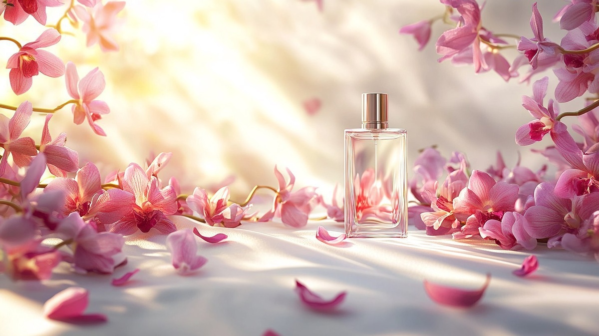 Создано на основе запроса: A white plain perfume bottle surrounded by blooming orchid petals, soft golden sunlight streaming through misty