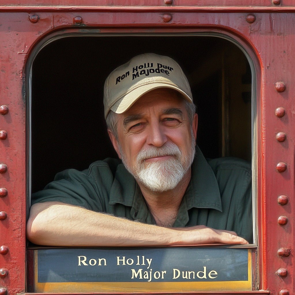 Создано на основе запроса: This man in the window of a red caboose zoomed in that has the words under the window in black "Ron Holly Major