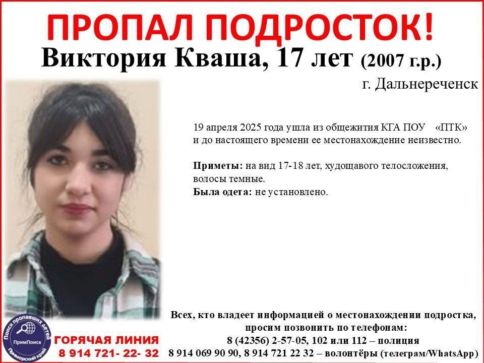 19 апреля 2025 года ушла из общежития КГА ПОУ «ПТК» и до настоящего времени ее местонахождение неизвестно.
