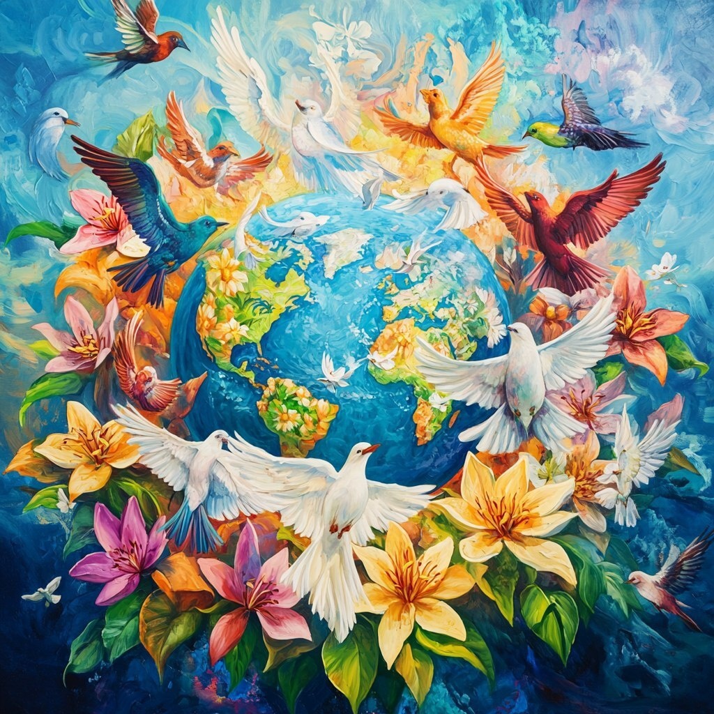 Создано на основе запроса: Show a delightful image of the world surrounded by lilies and peace birds , The color scheme is a vivid, novel