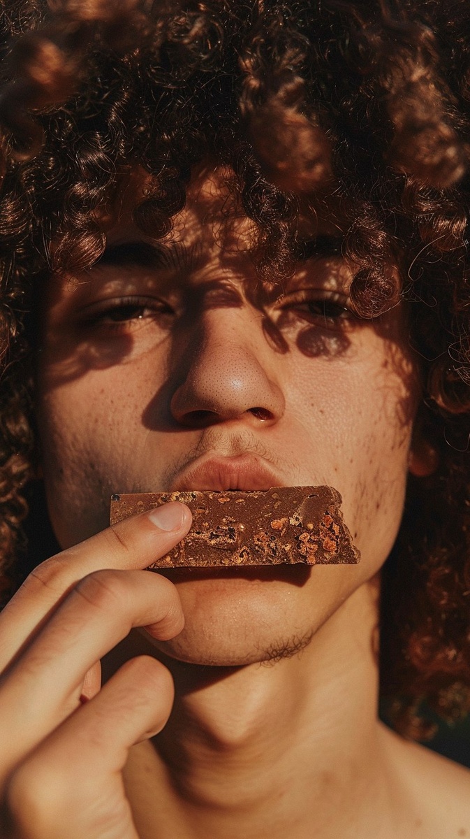 Создано на основе запроса: a light skinned latino young man with curly hair covering his eyes taking a bite of a chocolate ginger bar