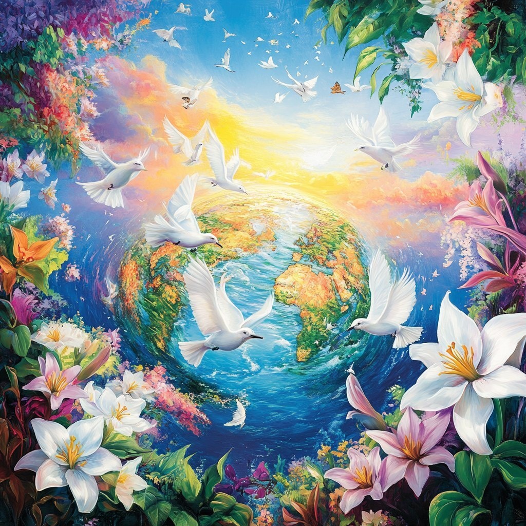 Создано на основе запроса: Show a delightful image of the world surrounded by lilies and white peace birds , The color scheme is a vivid, novel and very advanced combination, very detailed, realistic and colorful , massive scale, centered composition, 16k