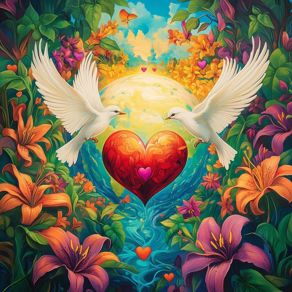 Создано на основе запроса: Show a delightful image of the world surrounded by lilies and heart love, peace birds , The color scheme is a
