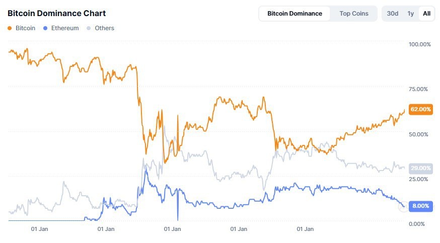 🚀 Bitcoin's dominance index just hit over 62%—the highest since 2021! Time to keep an eye on those market moves! 📈💰 #CryptoNews #Bitcoin