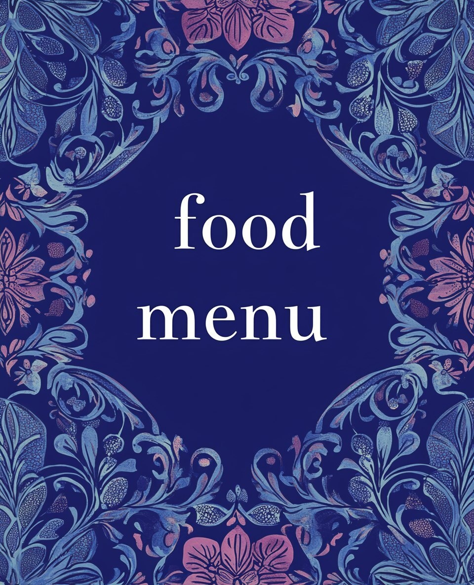 Создано на основе запроса: restaurant food menu cover in the style of azulejos, blue background, with darker blue and purple patterns, with the words "food menu" on it --- Автоперевод: Обложка меню ресторанов в стиле азулехо, синего фона, с более темными синими и фиолетовыми узорами, со словами «Меню еды» на нем Как тебе вариант? 🤔 https://dzen.ru/id/65c0c65c86e4f837c27b24d7 #ИИ #AI #нейросеть #midjourney #art