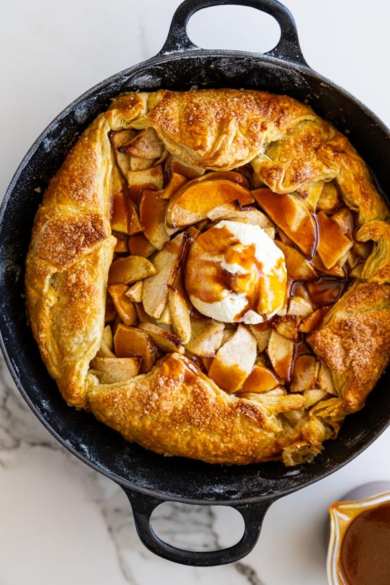 Эта легкая яблочная галета приготовленная из магазинного слоеного теста, станет идеальным десертом, если вы любите яблочный пирог, но не хотите возиться с тестом, начинкой и т. д. Яблочную галету часто готовят из слоеного или песочного теста, но я предпочитаю использовать слоеное тесто. Мало того, что использовать купленное в магазине тесто очень просто, мне еще и нравится, как выпекается маслянистое и слоеное слоеное тесто. Смело используйте любую корочку для пирога по вашему выбору. Галету определенно лучше всего подавать сразу после выпечки, но любые остатки можно хранить в герметичном контейнере в холодильнике до 3 дней, а затем разогреть в духовке, пока она не станет горячей. В чем разница между пирогом и галетой? Галеты — это деревенские пироги произвольной формы с начинкой из фруктов, сахара и специй, заключенной в тесто. Как сделать так, чтобы нижние галеты не намокли? Если вы выпекаете галету на нижней полке духовки, нижняя корочка станет хрустящей. Добавление нескольких стол