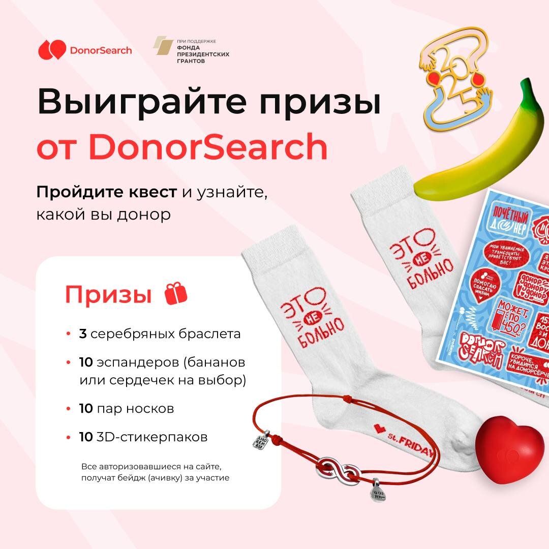 Та-даам! Этот день настал — запускаем интерактивную игру-квест для доноров 🩸 Наш виртуальный день донора — это шанс узнать: какой вы донор? И, конечно, выиграть один из 33 призов. ▪️ В розыгрыше: • 3 стильных серебряных браслета из коллекции с Amorem, • 10 ярких эспандеров (банан или сердечко — на выбор), • 10 уютных пар носков St.Friday Socks, • 10 топовых наборов 3D-стикерпаков, • а ещё — виртуальный бейдж каждому участнику в коллекцию на donorsearch.org Итоги — 28 апреля! ▪️ Вот как всё устроено: • проходите квест — отвечаете на вопросы, • получаете результат и номерки, • выполняете дополнительные задания — получаете ещё номерки, так шансы на победу растут! После квеста вам откроется доступ в чат, где можно познакомиться с другими донорами, обсудить результаты и поделиться впечатлениями, задать вопросы о проекте и просто пообщаться с близкими по духу людьми) С праздником вас и удачи! Благодарим команду Студии Чижова и Фонд президентских грантов за помощь в реализации проек