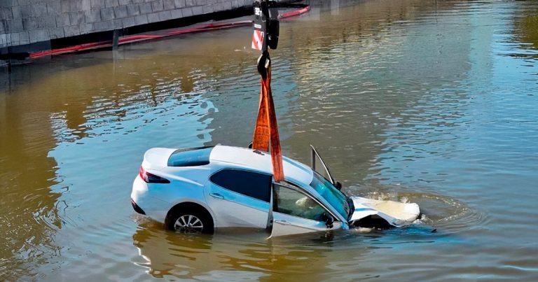 Белая машина полностью ушла под воду, с набережной было видно только очертания ее кузова. Водитель сумел самостоятельно выбраться из тонущего автомобиля и залезть на его крышу в ожидании спасателей. Однако ждать спасателей не пришлось — выбраться из реки мужчине помогли отзывчивые прохожие.