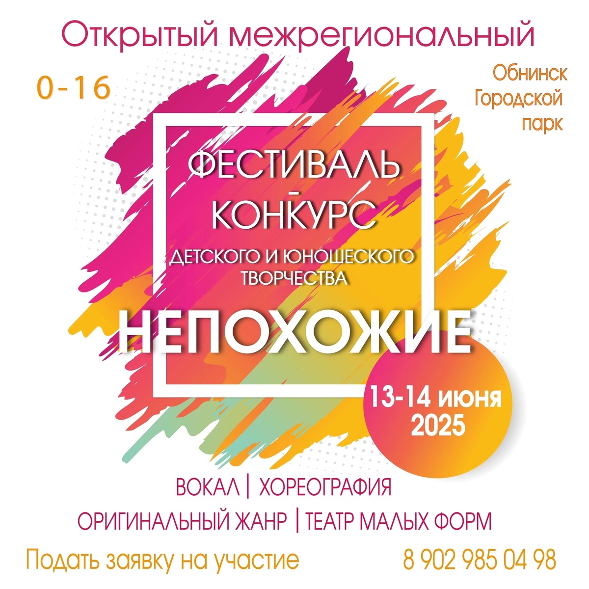 «Непохожие» - открытый фестиваль-конкурс талантов 13-14 июня в Городском парке. Конкурс проводится в следующих номинациях: - Вокал - Хореография - Оригинальный жанр - Театры малых форм Возрастные группы: - детская: 3-6 лет; - детская: 6-8 лет; - младшая: 8-10 лет; - средняя 10-12 лет; - старшая 12-16 лет; *смешанная детская: 4 – 9 лет; смешанная старшая: 10 – 18 лет. Подробности👉 https://vk.com/festregion 👍 Подписаться | Прислать мероприятие