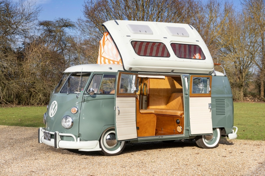 Этот ультраредкий Volkswagen Type 2 T1 Camper Van с проходом из кабины в жилой отсек и с двумя распашными дверями по бокам — настоящая жемчужина среди фургонов своего времени. По данным Bonhams, в мире сохранилось всего три подобных экземпляра, и один из них был продан на аукционе в Гудвуде. Автомобиль был собран 26 августа 1964 года как модель 1965 года и отправлен новым в Сан-Франциско, США. В Калифорнии компания EZ Campers установила на него уникальный интерьер, сохранив при этом редкие передние ступени от EZ, что сегодня является большой редкостью. После долгих лет в районе Сакраменто и последующего простоя, фургон был выкуплен компанией Vintage Warehouse, специализирующейся на редких VW. Именно в этот период были установлены поднимающаяся крыша и двухъярусные спальные места. В 2005 году автомобиль был ввезён в Великобританию, где в течение 12 лет находился у одного владельца. Он провёл масштабную и дорогостоящую реставрацию без компромиссов в мастерской Haywood Classic & Custom. Д