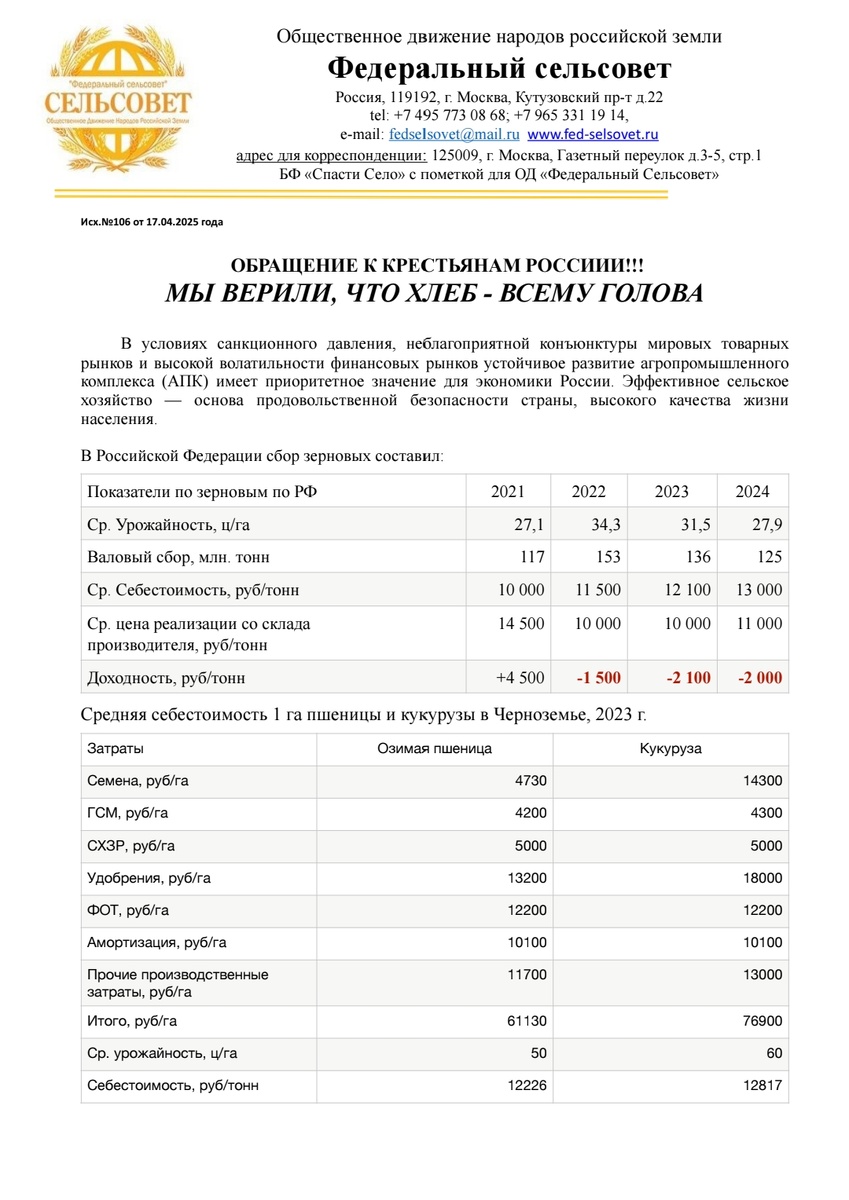 Мы верили, что хлеб – всему голова! В условиях санкционного давления, неблагоприятной конъюнктуры мировых рынков и высокой волатильности финансовых рынков устойчивое развитие агропромышленного комплекса (АПК) имеет приоритетное значение для экономики России. Эффективное сельское хозяйство – основа продовольственной безопасности страны, высокого качества жизни населения. Мы, Объединение "Федеральный Сельсовет", обращаемся к вам, труженикам земли, с болью и тревогой за будущее российского села. Представленная статистика показывает, что, несмотря на высокие урожаи в последние годы, российские крестьяне несут огромные убытки. Приводимые цифры говорят сами за себя: • 2022-2024 гг. – массовое прекращение деятельности КФХ и средних с/х предприятий. В некоторых регионах - катастрофические показатели (до 10% в Ростовской области за год). • Прогноз на 2024-2025 гг. – ликвидация или прекращение деятельности около 10 000 КФХ и более 2 миллионов ЛПХ! • Себестоимость производства зерна раст