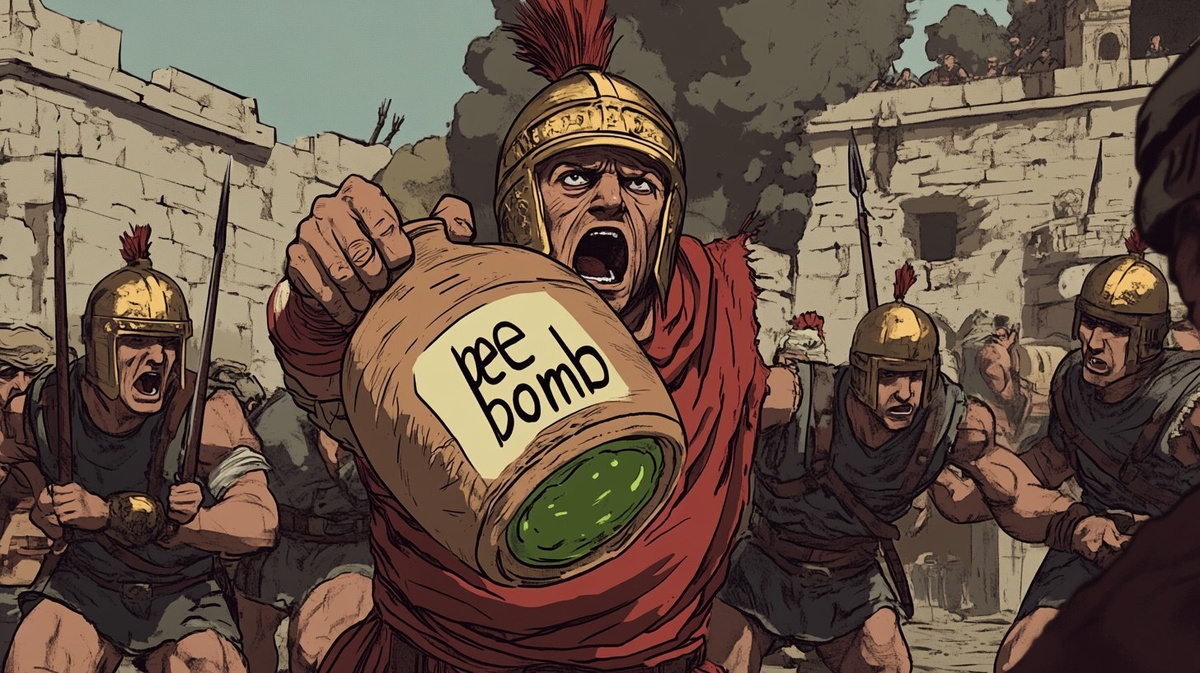 Создано на основе запроса: Hannibal mid-battle, throwing a clay jar with greenish liquid labeled "pee bomb", enemy soldiers reacting in