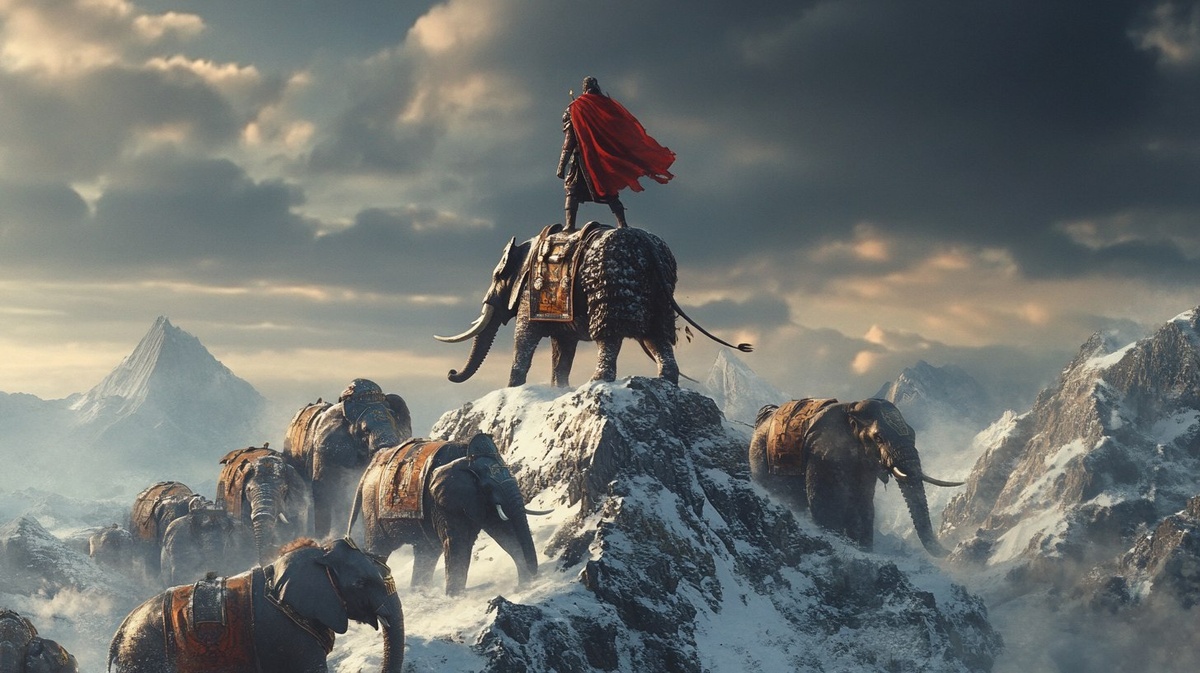 Создано на основе запроса: Hannibal standing proudly on a snowy mountain peak, surrounded by elephants in battle armor, dramatic sky