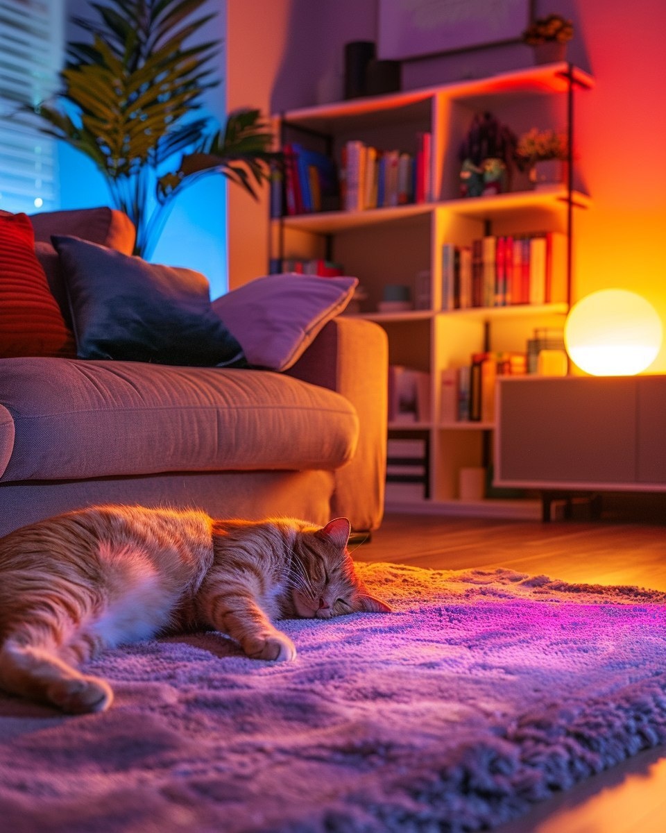 Создано на основе запроса: a cozy, colorful living room interior with a wooden floor, soft textured gray rug, a modern beige sofa with pillows, vibrant warm lighting and deep shadows, bookshelf with colorful books and decor in the background, an orange tabby cat lying relaxed on the sofa, high contrast, rich saturated colors, stylized AI-generated look, dreamy and artistic ambiance, no vacuum cleaner, no text