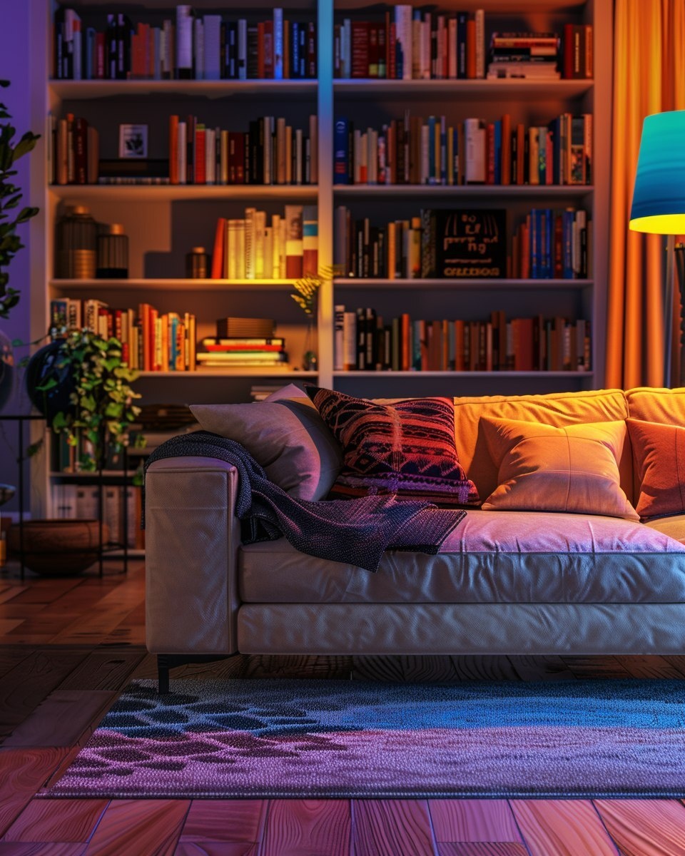 Создано на основе запроса: a cozy, colorful living room interior with a wooden floor, soft textured gray rug, a modern beige sofa with pillows, vibrant warm lighting and deep shadows, bookshelf with colorful books and decor in the background, high contrast, rich saturated colors, stylized AI-generated look, dreamy and artistic ambiance, no vacuum cleaner, no text