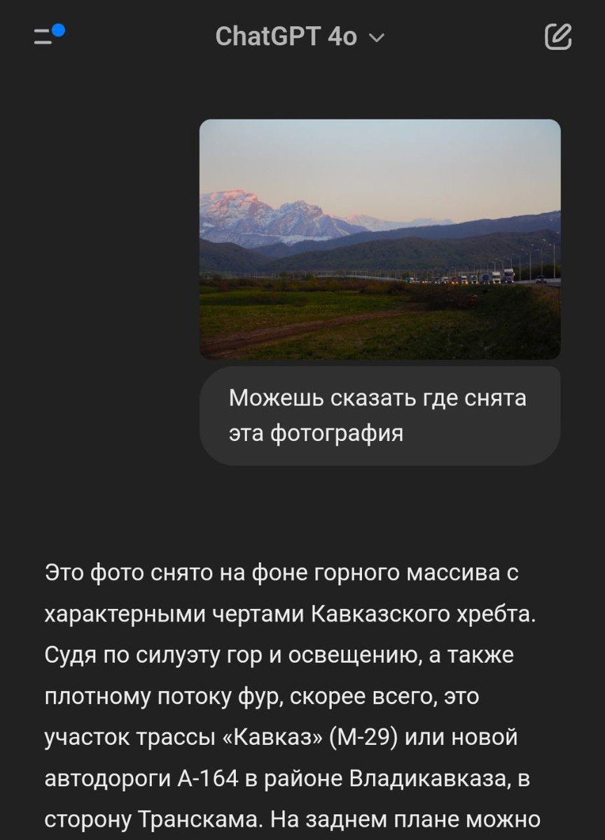 ЧатGPT определяет местоположение по фотографии с почти абсолютной точностью. Достаточно одного кадра с горной дорогой — и он безошибочно называет: это объездная около Владикавказа, на фоне Казбека. Без подсказок, без геометок. Если раньше нейросети путали горы с холмами, а Осетию с Австрией, то теперь — наоборот: машину стало трудно обмануть. Она видит детали, замечает оттенки света и строит контекст, как опытный путешественник. Мир становится всё прозрачнее. Вопрос в том, готовы ли мы к этому.