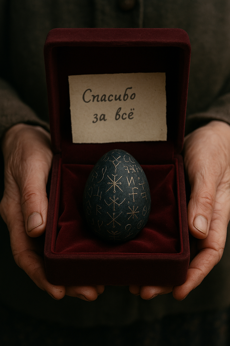 Оно было из тёмного синего стекла, почти чёрного, но стоило на него попасть солнечному лучу, как на поверхности заиграли завораживающие отблески — от холодного сапфира до иссиня-серебристых переливов. Всё яйцо было покрыто тонкими, почти невидимыми на первый взгляд символами — будто гравировкой. Они сплетались в узоры, как древняя вязь, которую не считывает глаз, но чувствует душа. Легонько потрясла коробку — в бархате выпала маленькая записка: «Спасибо за всё». Ни подписи, ни даты.