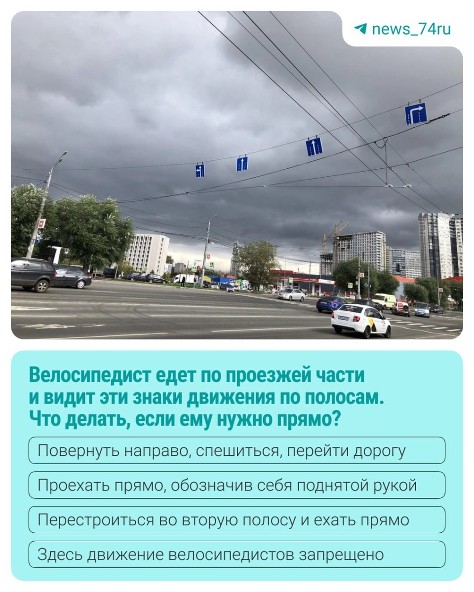Знакомая нашей редакции ехала на велосипеде по дороге в правой полосе, которая на перекрестке оказалась отведенной исключительно под поворот. Ей же нужно было прямо. Велосипедистку озадачило, что делать в таком случае: ехать наперерез поворачивающему потоку машин или поворачивать с ними направо? Свой ответ оставляйте в комментариях⬇️ Не хватило? Вот десять вопросов, на знание ПДД для велосипедов →