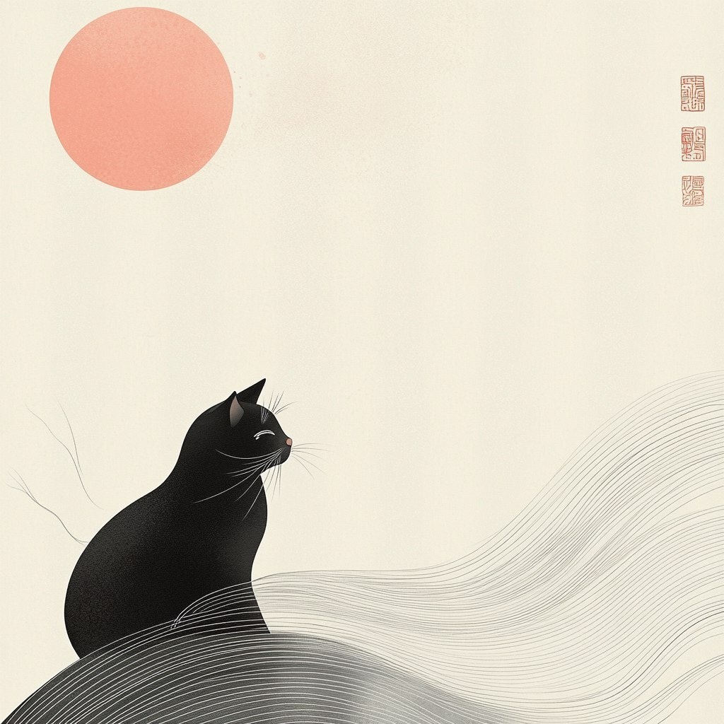 Создано на основе запроса: An abstract cat illustration in the style of traditional Japanese ukiyo-e, flowing lines, simplified shapes, soft