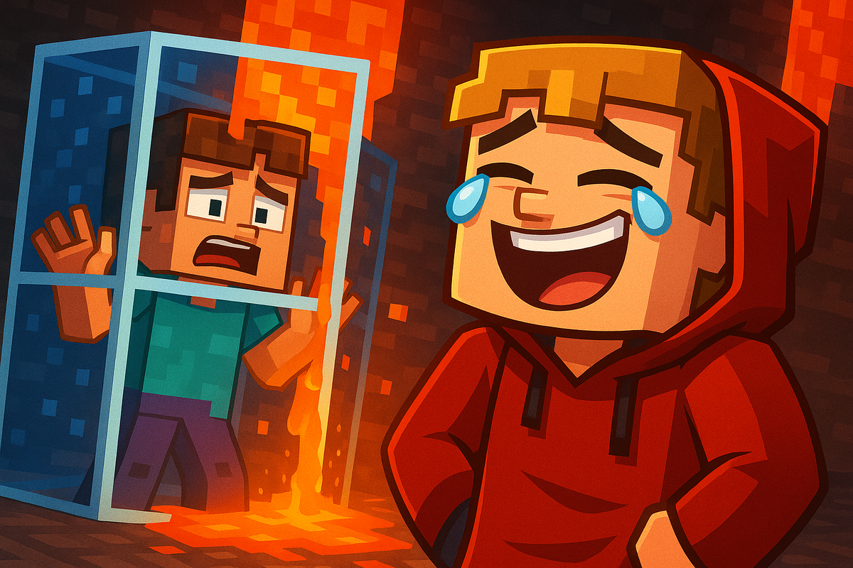 Построй шахту с лестницей, которая внезапно заканчивается в бассейне лавы. Друг думает, что копает алмазы… а ты просто топишь его мечты!