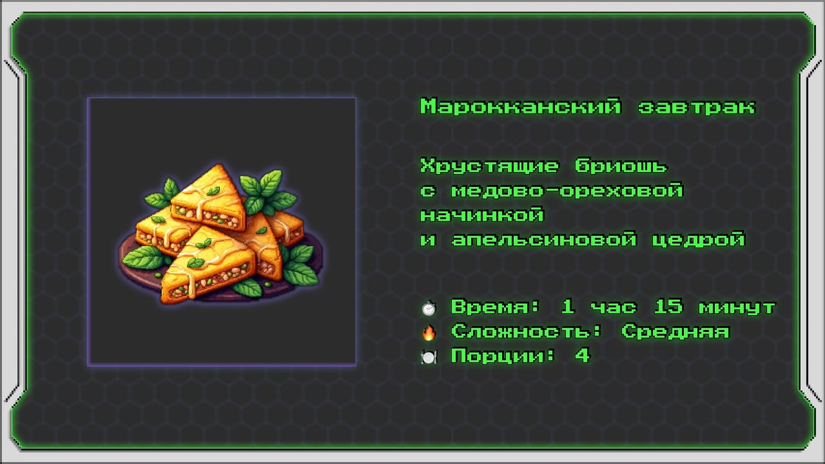 Марокканский завтрак Хрустящие бриошь с медово-ореховой начинкой и апельсиновой цедрой Этот рецепт представляет собой креативную интерпретацию традиционных марокканских бриошь — слоёных пирожков, которые обычно готовят с савойской капустой или мясом. В этой версии используется сладкая медово-ореховая начинка с ароматной апельсиновой цедрой, что делает их идеальными для сытного и изысканного завтрака. Информация о рецепте: ⏱️ Время: 1 час 15 минут 🔥 Сложность: Средняя 🍽 Порции: 4 Ингредиенты: Для теста: • 🍞 Мука — 300 г • 💧 Тёплая вода — 150 мл • 🫒 Оливковое масло — 2 столовые ложки • 🧂 Соль — щепотка Для начинки: • 🌰 Миндаль (обжаренный и мелко нарезанный) — 100 г • 🌰 Фисташки (мелко нарезанные) — 50 г • 🍯 Мёд — 3 столовые ложки • 🍊 Апельсиновая цедра (мелко натёртая) — 1 чайная ложка • 🌶 Корица молотая — ½ чайной ложки Для жарки: • 🍳 Растительное масло — для фритюра Для подачи: • 🍯 Мёд — для полива • 🌿 Мята свежая — для украшения Приготовление: Шаг 1: Подг