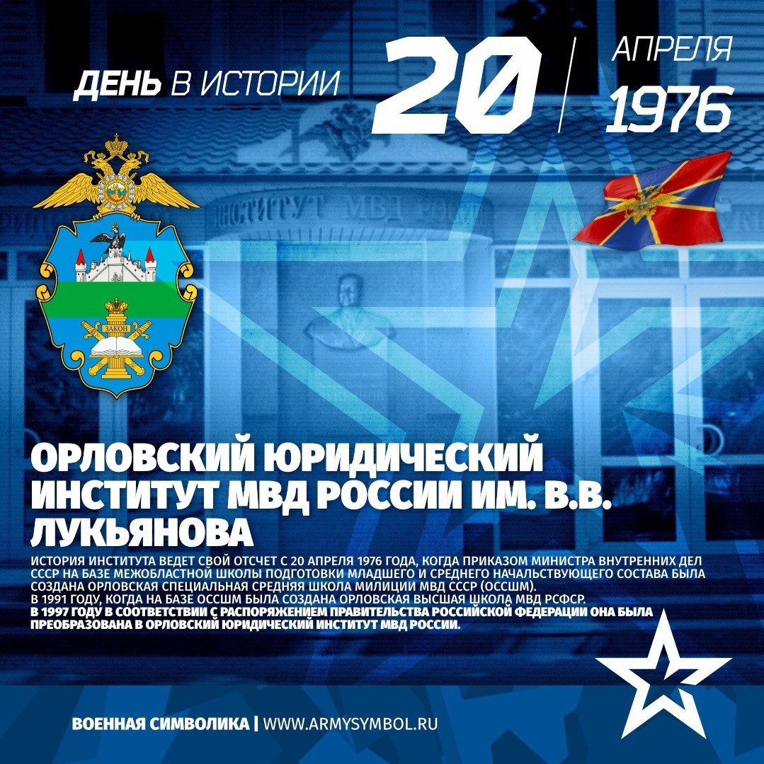 Орловский юридический институт МВД России с 1976 История института ведет свой отсчет с 20 апреля 1976 года, когда приказом Министра внутренних дел СССР на базе межобластной школы подготовки младшего и среднего начальствующего состава была создана Орловская специальная средняя школа милиции МВД СССР (ОССШМ). В 1991 году, когда на базе ОССШМ была создана Орловская высшая школа МВД РСФСР. В 1997 году в соответствии с распоряжением Правительства Российской Федерации она была преобразована в Орловский юридический институт МВД России. #ПамятныеДатыВоеннойИсторииОтечества #ДеньВИстории #ГодЗащитникаОтечества #80ЛетВеликойПобеды Источник: https://vk.com/wall-60767131_30443 Подпишитесь на наши группы ВКонтакте и в Одноклассниках - читайте, смотрите и комментируйте! Источник