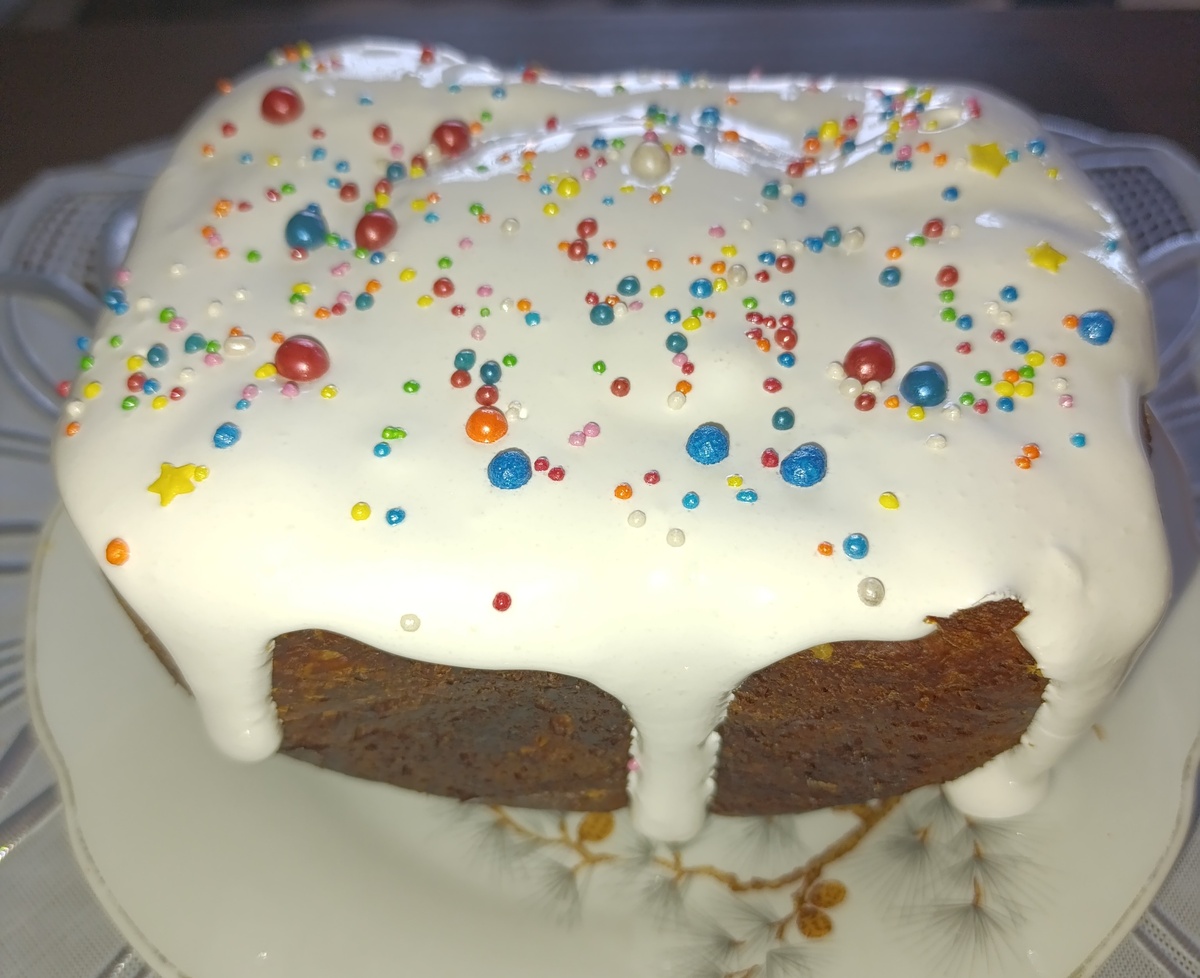 Ингредиенты: мука 500 гр яйца 3 шт молоко 200 гр масло сливочное 150 гр сахар 100 гр дрожжи 1 пачка (быстрорастворимых) соль, ванилин щепочка изюм количество по желанию глазурь (рецепт приготовления здесь) цветные посыпки Изюм промыть и замочить на 30 минут в воде. Дрожжи развести теплым молоком, добавить 1 сл л сахара и оставить на 15 минут (должна появиться пенная шапочка). Яйца взбить с сахаром, ванилином и сливочным маслом (оно должно быть комнатной температуры) и добавить к дрожжам. Добавить муку, соль, перемешать. Вмешать в тесто изюм. Выложить тесто в форму, заполнив на одну треть. Поставить в духовку на 30 минут на 100 градусов. Тесто должно подняться за это время и заполнить две трети объема формы. Затем выпекать при температуре 150 градусов 30 минут. Если форма большая, то время увеличить, периодически проверяя готовность. Достать кулич, остудить, смазать помадкой и посыпать цветными посыпками. Приятного аппетита!!!!