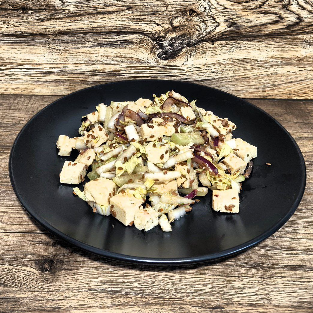 Салат с тофу Пришла весна, а это значит, что пора переходить на зелень. Главное не забывать про белок, этот салат совмещает в себе и то, и другое. Тофу безвкусный и является полуфабрикатом, просто так его особо не поешь, его обязательно готовить. Он приобретает вкус тех продуктов, с которыми смешан. Ингредиенты: Пекинская капуста, пять-шесть листочков. Сыр тофу, 200 г/упаковка. Лук красный, 1 шт. Семена льна. Масло из семян льна. Адыгейская соль, чёрный перец. Приготовление: Нарезаем произвольно, перемешиваем. Это базовая конфигурация салата, туда можно добавить что угодно на ваш вкус. Зимой я добавлял морковку или дайкон. Сейчас можно добавлять перец или помидор. В общем, на ваш вкус. Самое главное здесь — это база, сыр тофу содержит много белка, пекинская капуста содержит витамины и клетчатку, и просто она мне очень нравится. Красный лук содержит биофлавоноиды, семена льна и масло из семян льна содержат полезные жиры. Также можно добавить бальзамический уксус, он совсем н